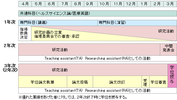 博士後期課程修了のためには、本課程に3年以上在学して14単位以上修得し、かつ、必要な研究指導を受けたうえ、博士論文の審査及び最終試験に合格することが必要です。 履修科目は、保健学専攻共通科目4単位、講義および演習をそれぞれ2単位以上の計4単位以上、保健学特別研究6単位の合計14単位以上とし、指導教員の指導に基づき選択します。 ただし、在学期間に関しては、学府教授会が優れた業績を上げたと認めた者については、2年以上在学すれば足りるものとします。