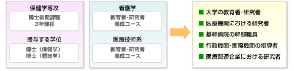 その後、2009年(平成21年)4月に医学系学府保健学専攻博士後期課程を新たに設置しました。これにより、保健学領域における豊かな学識の滋養を基盤としつつ、自立した研究活動を行う能力を持つ教育者・研究者、看護・医療技術領域における実践能力と高い教育・研究能力を併せ持つ人材の養成を行っているところです。同一キャンパスでは、医学、歯学、薬学の博士課程教育が既に実施されており、医療に関連した多領域の有機的な連携を推進し、保健学領域における教育・研究の拠点を形成することにより、その成果を地域社会・国際社会へ還元しています。